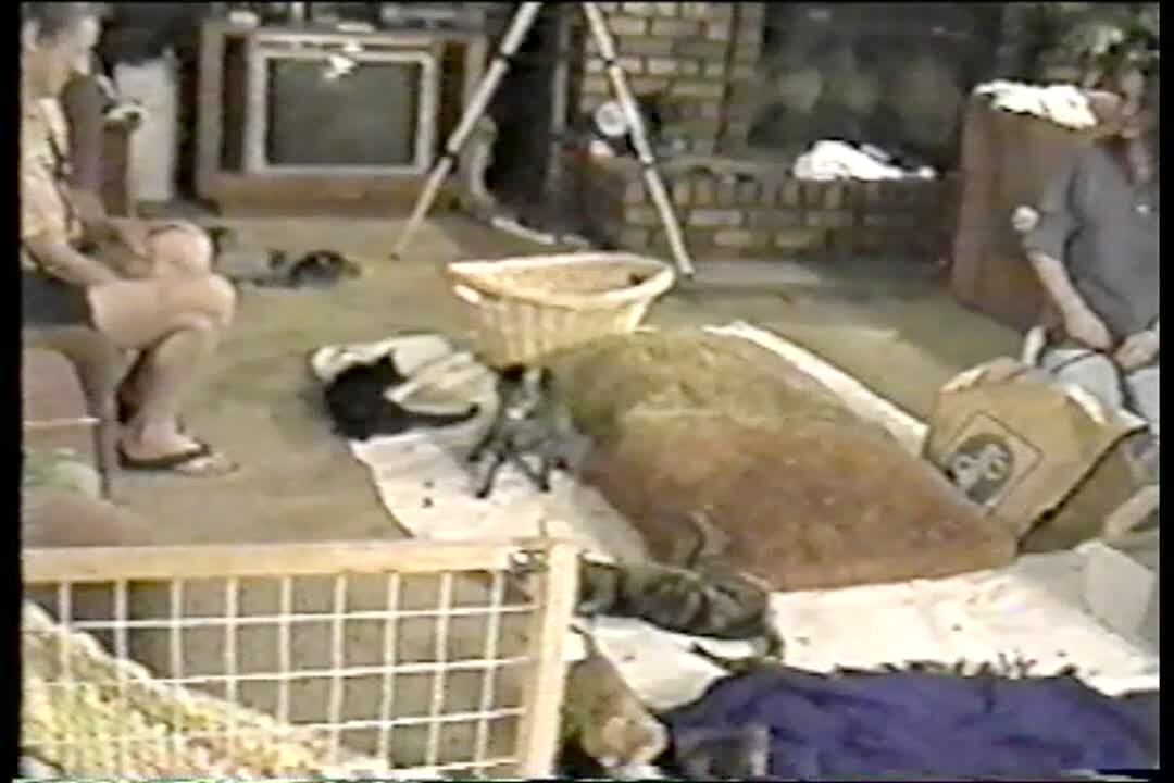 A woman calls her dog to the camera but the dog doesn't want to cross the cat hiding under a bed. He takes a step and the cat claws at him repeatedly.