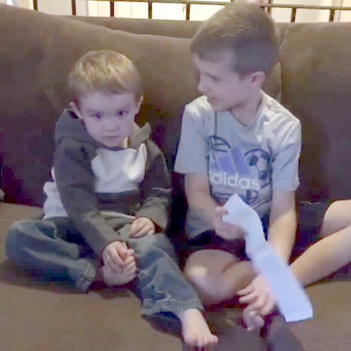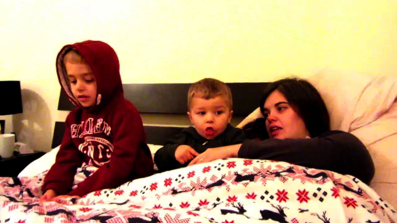 Parents tell young boys that mom is pregnant. Tot says "You did it Dad!" & looks for baby in mom's mouth. Big news, surprise. Cute. (1323)