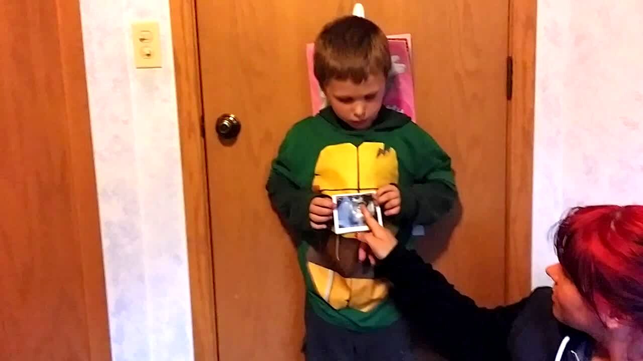 A woman tells her son that she's having another baby and he is surprised. He asks how she knows and says she should ask dad because he might not like it.