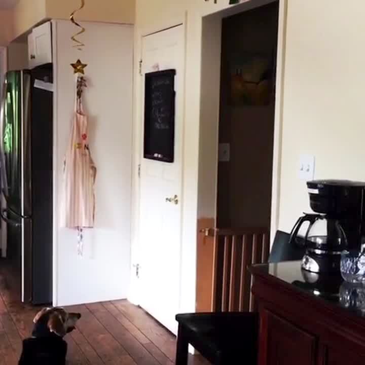 A group of people wait in the kitchen and yell "surprise" when a woman walks in for a surprise birthday party and she gets scared and falls.