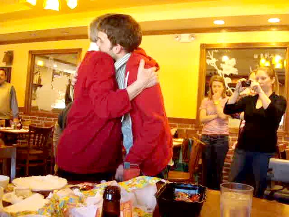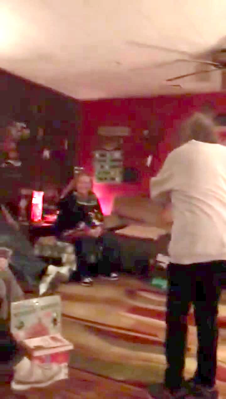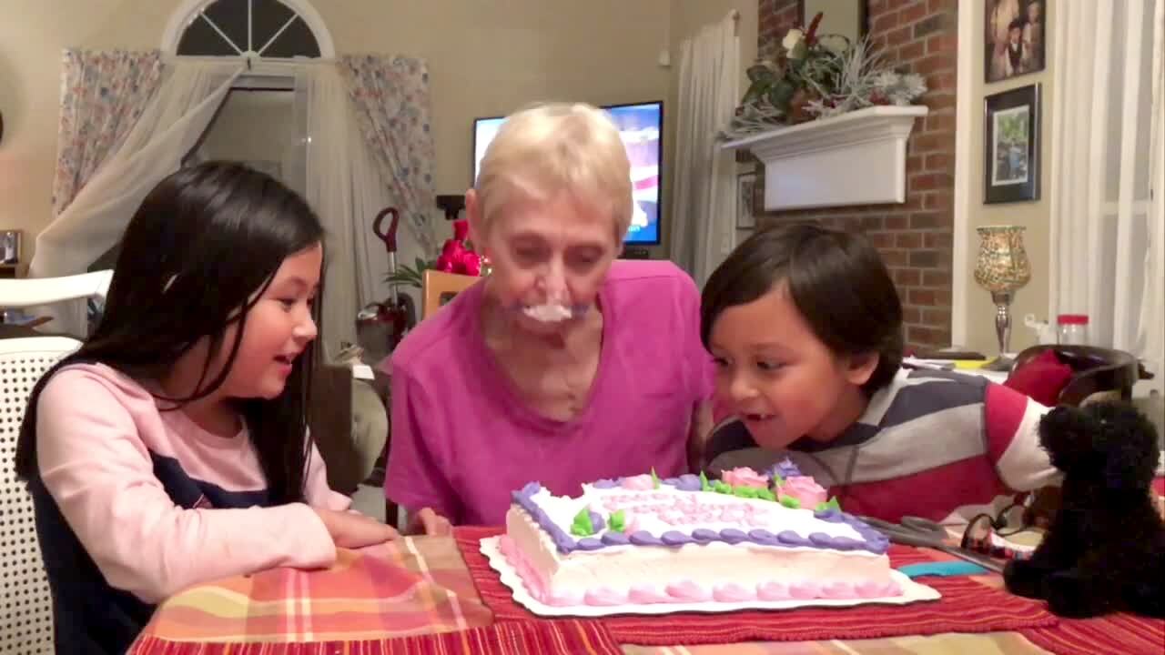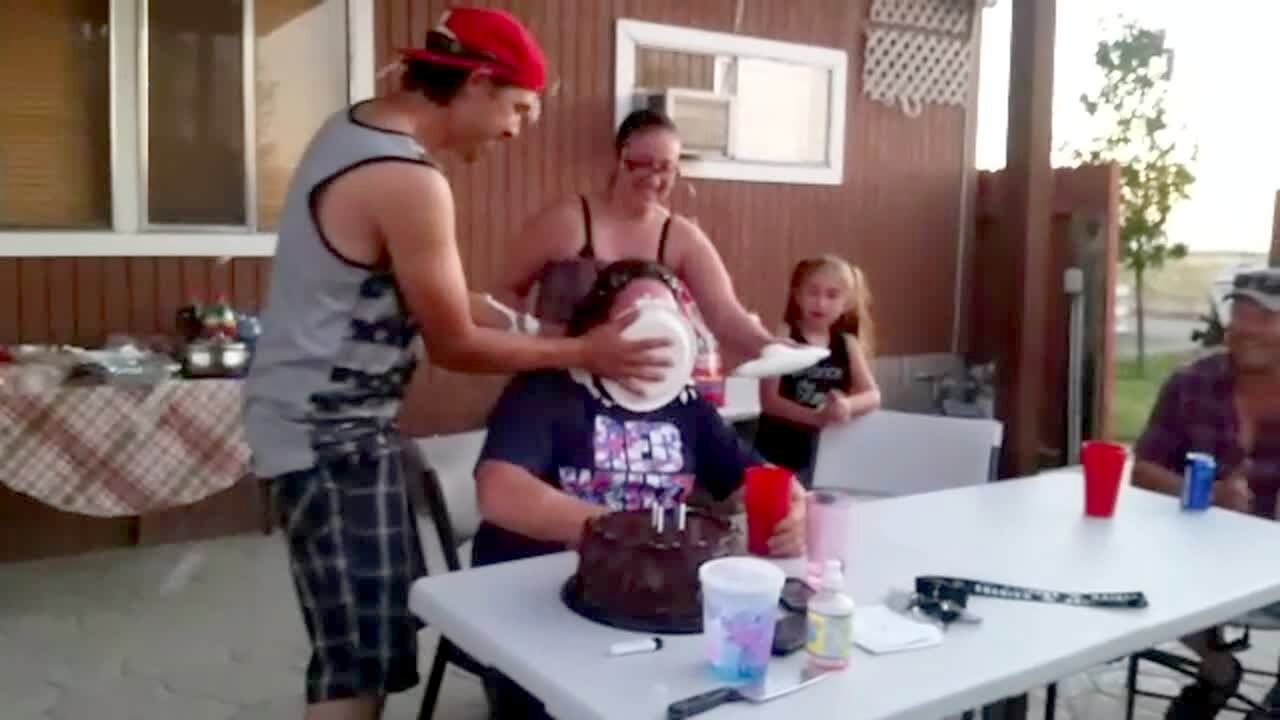 Senior woman smashes a pie in her adult grandson's face at a birthday party, crosses the item off her "bucket list." Practical joke.