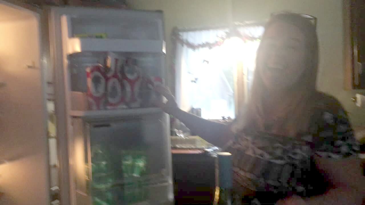 A woman opens her refrigerator to find that everything inside has been wrapped in Christmas paper