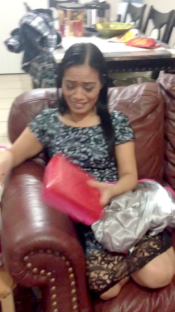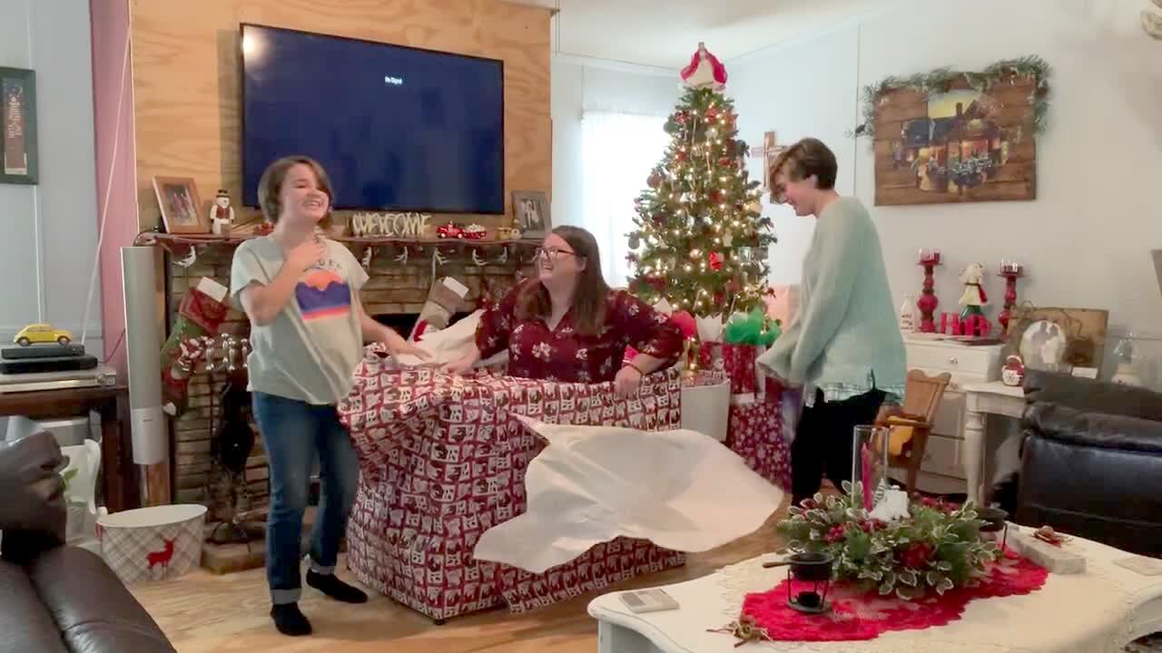 Two teen girls open a Christmas present in the living room that makes the sound of a goat. A woman comes out of the present and surprises them.