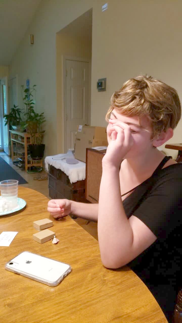 A teen girl gets a literal nose ring for her birthday in the kitchen.