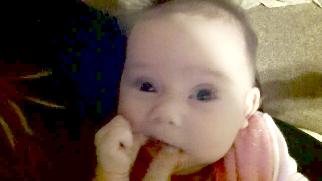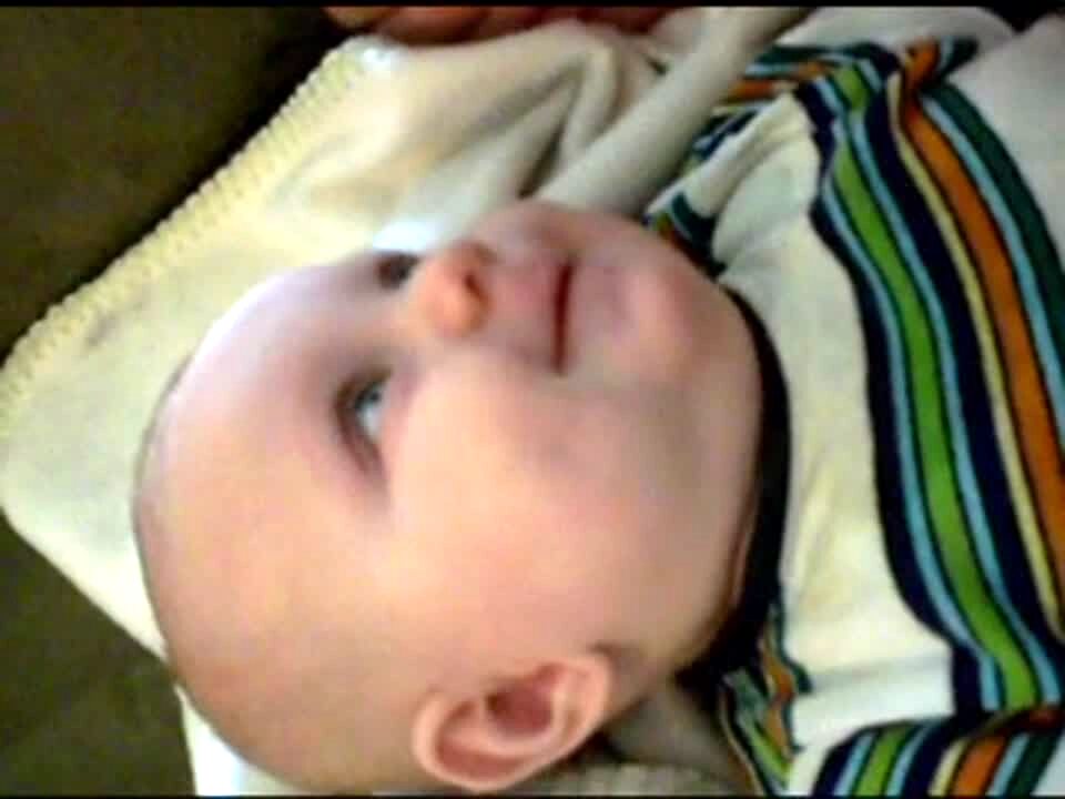 Baby boy stares at the camera as he lays on his back and smiles a bit, then it sounds like he says "I love you." Baby talk.