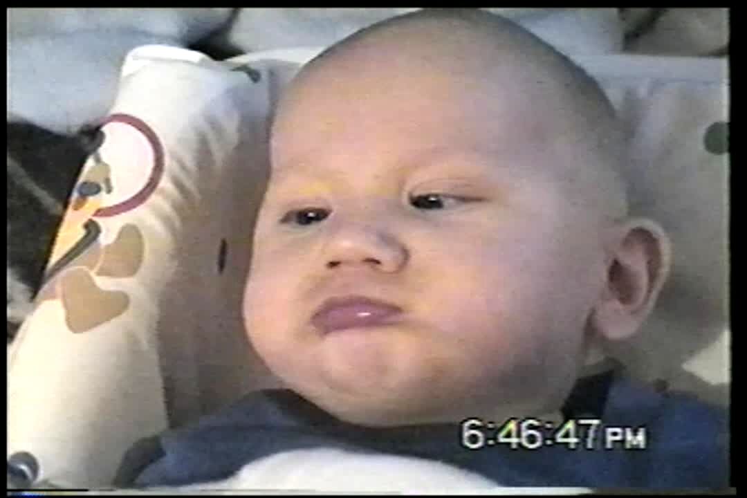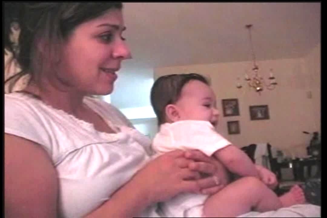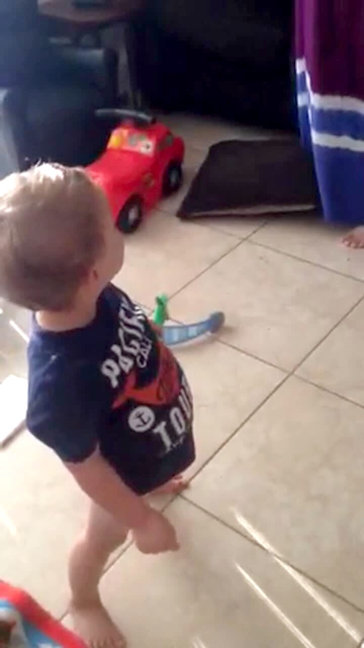 A woman films a baby boy at home, then it sounds like the baby boy says "can you back up?"