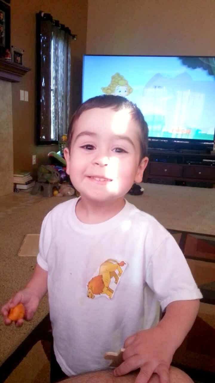 A baby boy tot struggles to smile for a photo on command as a little boy smiles well.
