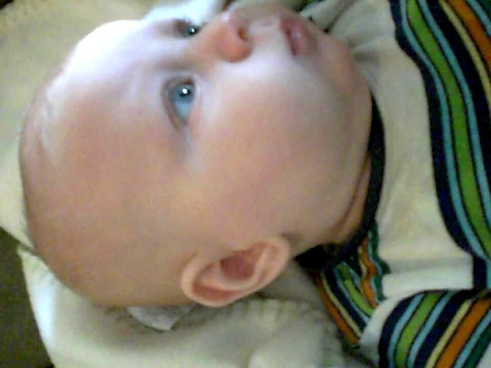 A baby boy shakes his head when his mother asks him to smile for a picture.