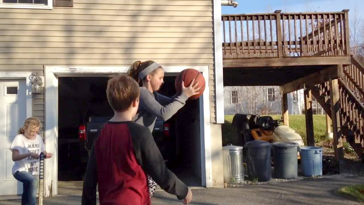 A man in a swimming pool in a yard throws a ball to a Boston Terrier dog outside the pool and the dog jumps up and knocks the ball into a toy basketball hoop.