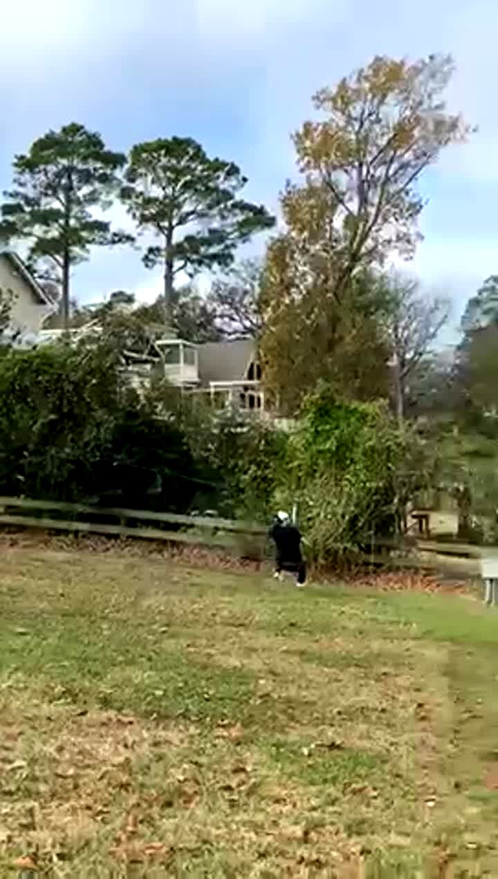 A young boy throws an axe at a target on a porch, but he misses and breaks a window. Security footage.