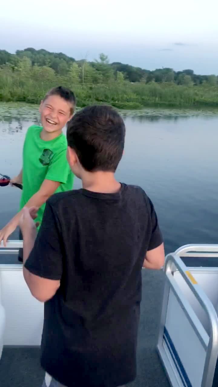 A young boy fishes on a boat in a lake and casts a line and the bait fish hits him in the back of his head.