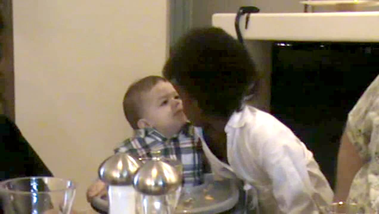 Baby boy wants to kiss older girl and pulls her shirt to get her to come closer so they can kiss some more. Cute, love.