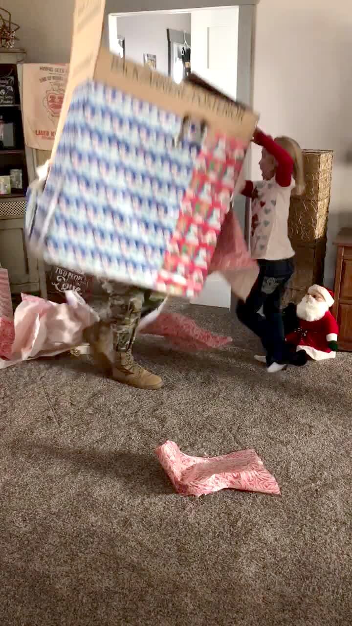 A young girl unwraps a large gift on Christmas and gets surprised by her military big brother, who jumps out of the box.