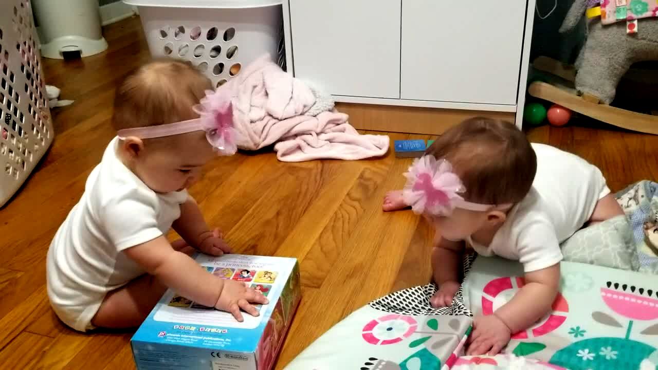 Twin baby girls in a bedroom fight over a box. One of the girls grabs the other girl's hair bow and snaps it back in her face and the man with the camera laughs.