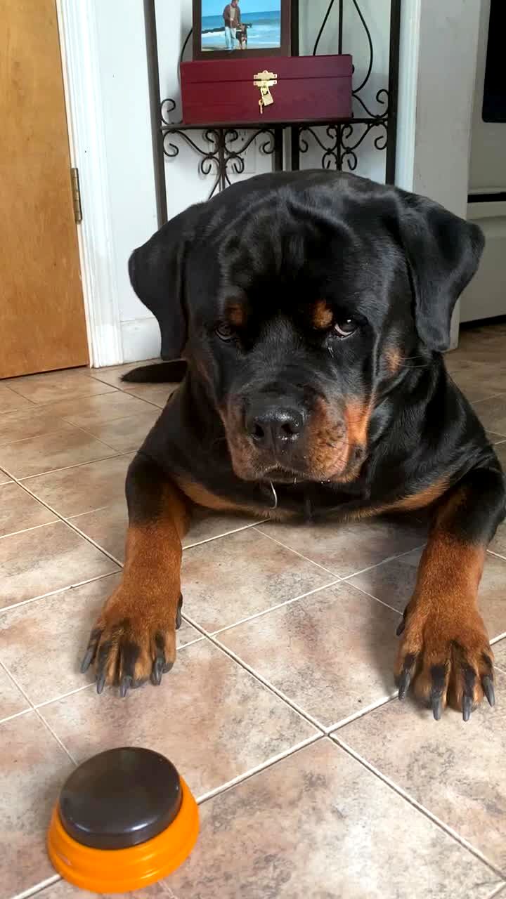 A woman says "how am I gonna stop you from barking in the back yard," to her Rottweiler dog, and the dog hits a button that says "put me in the front yard!"