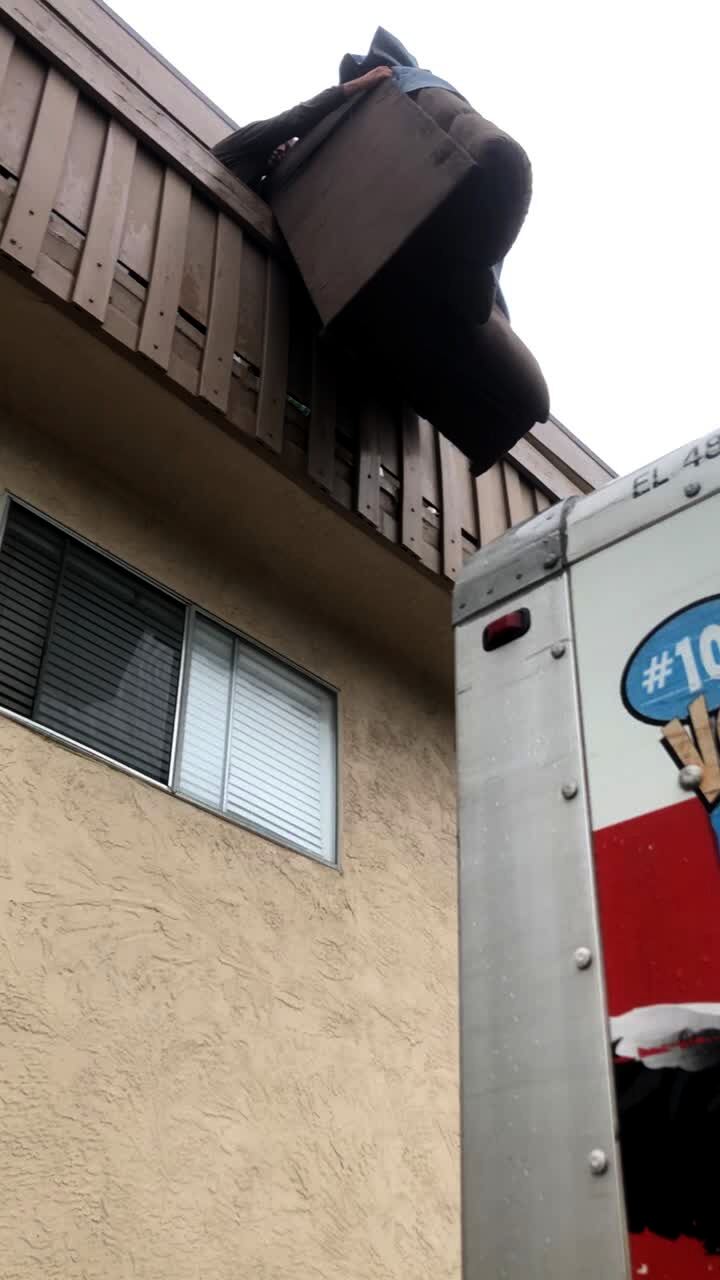 Two men push a couch off the roof of a building and hang it from a rope, and it swings against a window and breaks it, and a woman inside says she is fine.