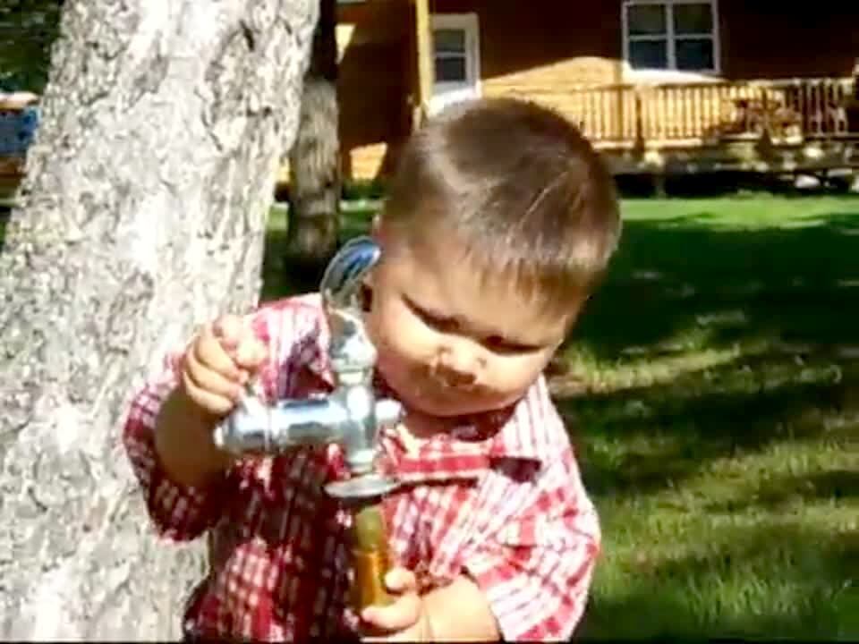 "Drinking Problem" Tot boy tries to drink from garden hose. He keeps spraying himself with the hose. He says "ahh" when he finally gets a sip. He is soaking wet. Cute