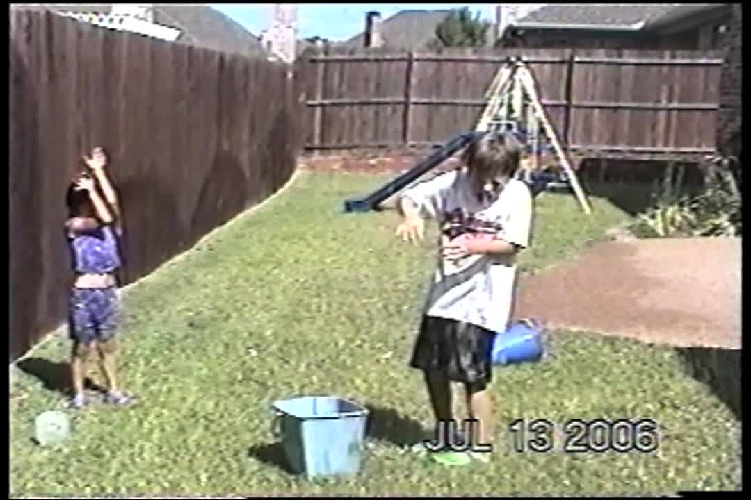 Young boy holds a bucket of water. Boy drops the bucket and it splashes him, gets him wet.