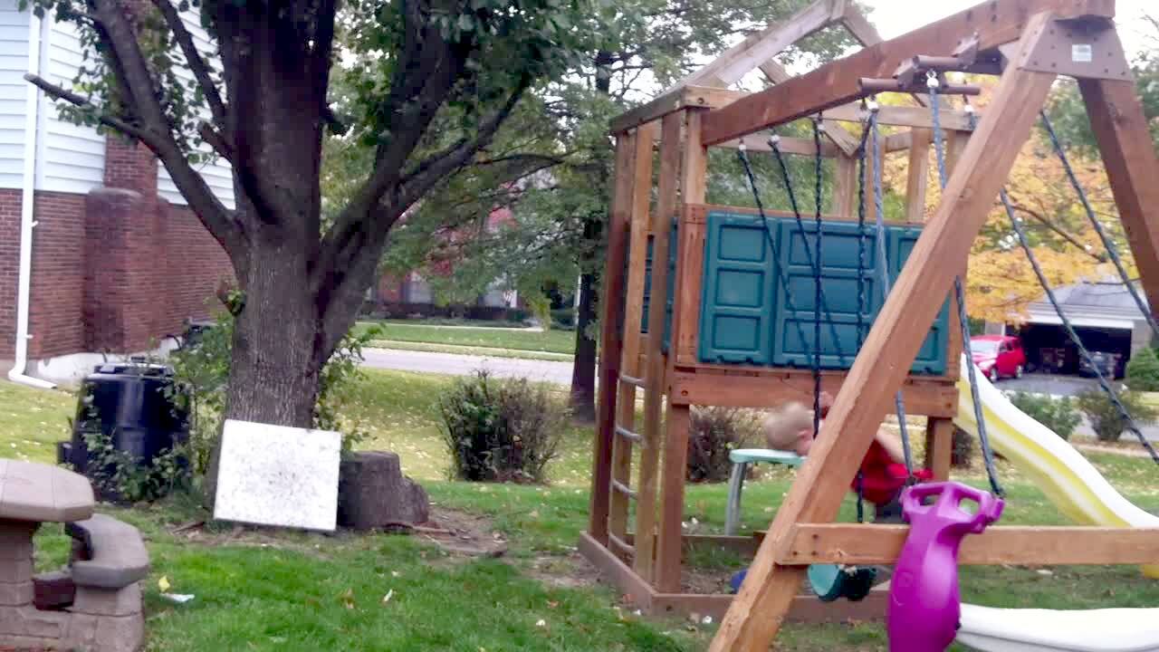 A young boy jumps off of a swing, lands on a toy picnic table, and hits his head at :16.