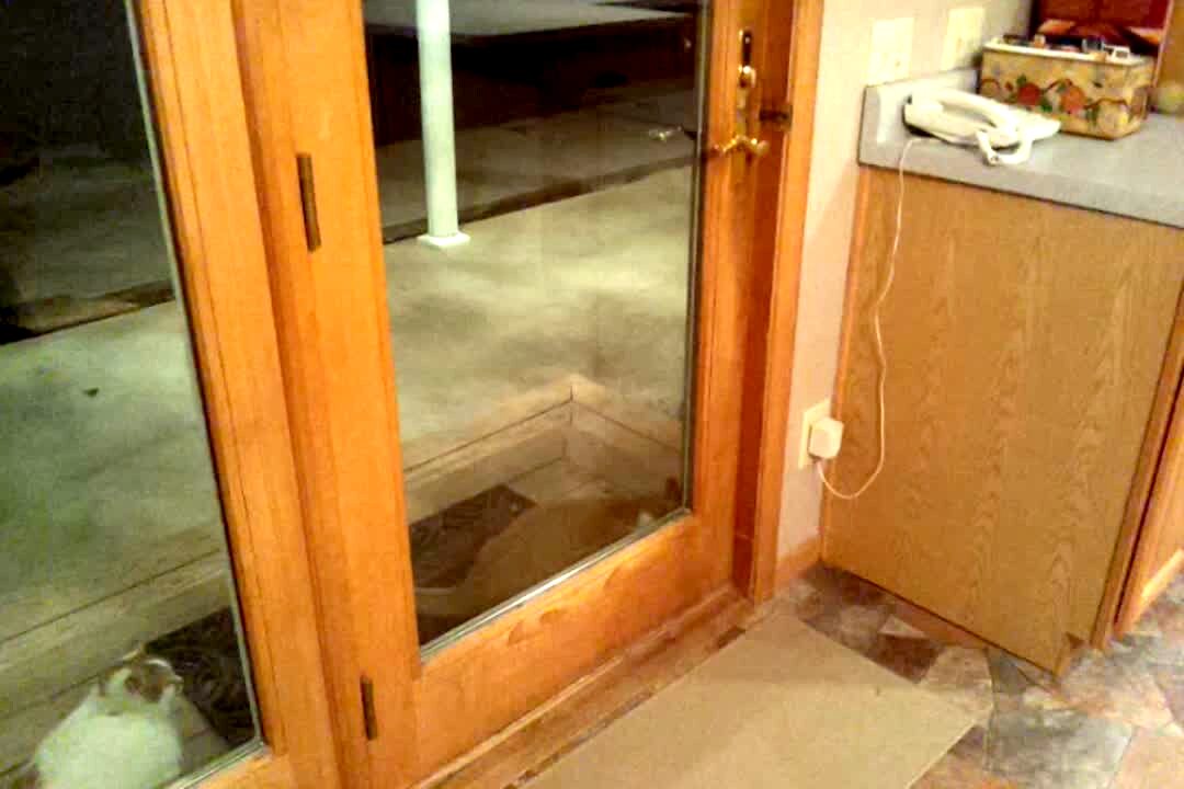 A cat gets into kitchen cabinets and pulls out glass bowls. They crash onto the floor and a senior woman comes into kitchen confused about what happened.