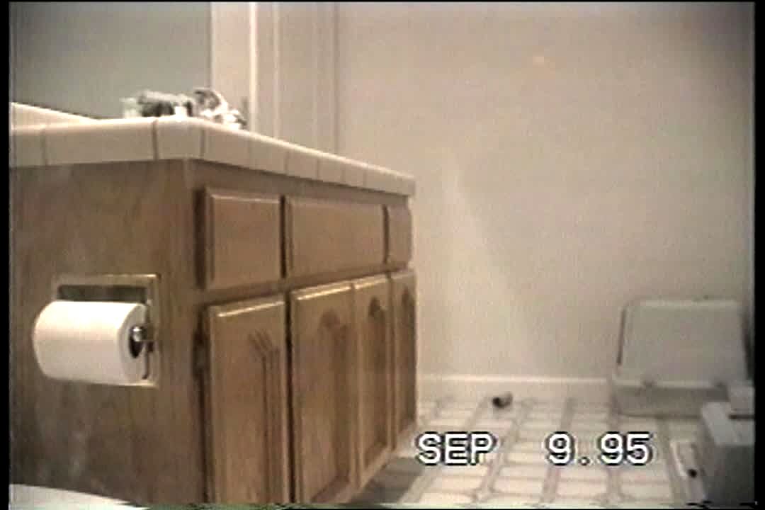 A cat in a bedroom jumps from a shelf onto the top of a door. A woman laughs and curses. The cat then does the splits between the door and the door frame.