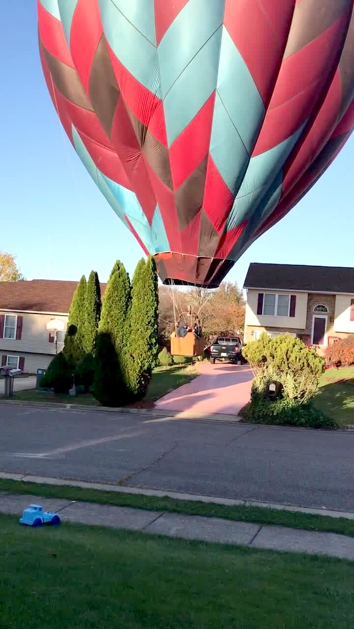 A hot air balloon makes an emergency landing in a front yard. No releases for the people in the balloon.