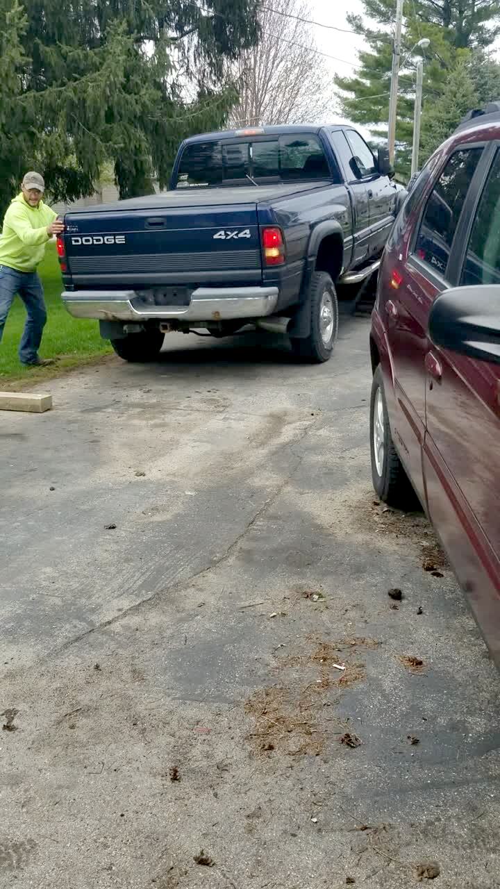 A man reverses a truck off a trailer ramp and without the ability to break he smashes right through a garage door.