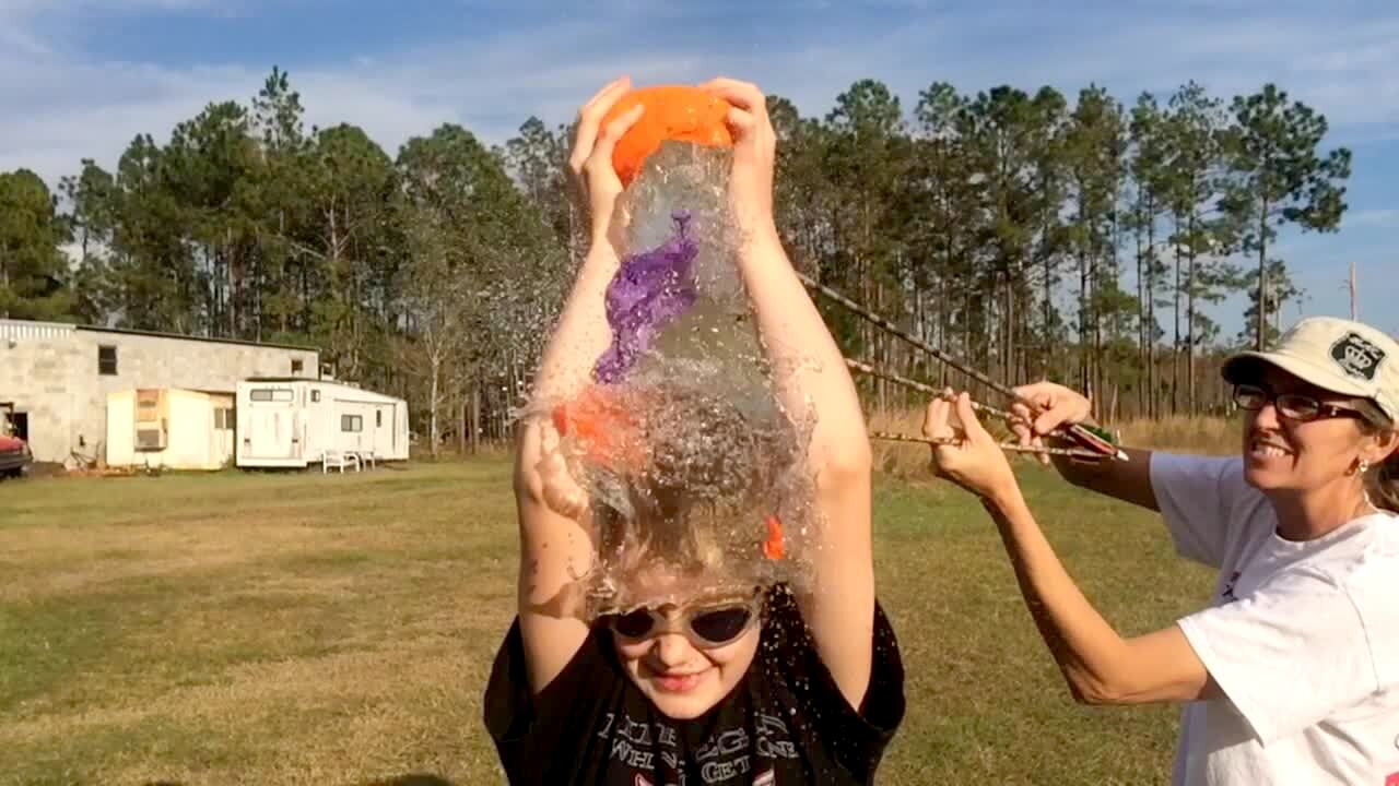 A woman pops three water balloons on another woman's head in slow motion. AA: Water balloons in super slo-mo.