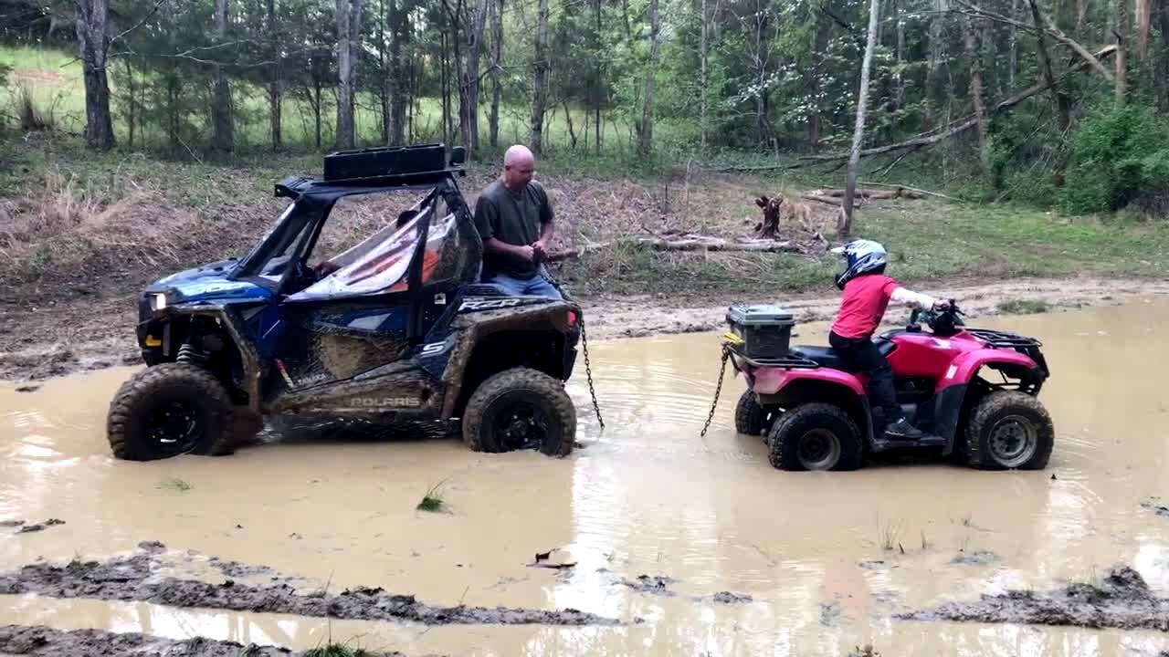 A man tries to pull a young boy's four wheeler out of the mud with a RZR and falls into the mud.