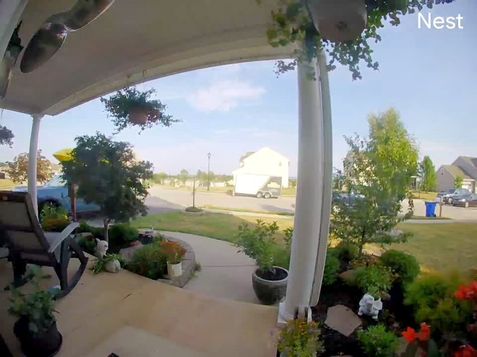 A young boy yells, "papa," after his grandpa tests out an ATV to see if he fixed it but it flies and he topples off of a front porch into a yard. The man then yells from the ground, "it works!" Security footage.