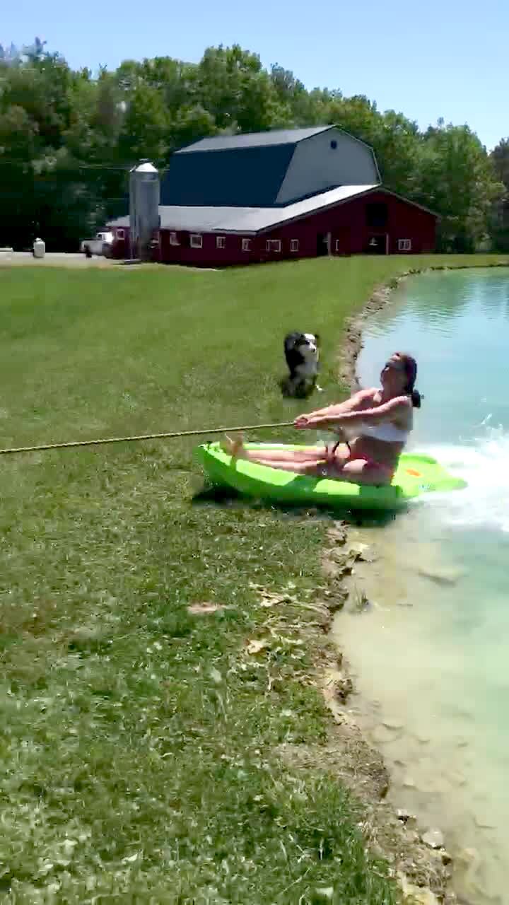 A teen boy and girl drive a four wheeler in a field and tow a teenage girl in a kayak across a lake. The kayak slides out of the water into the field and the teen girls falls out of the kayak onto the grass.