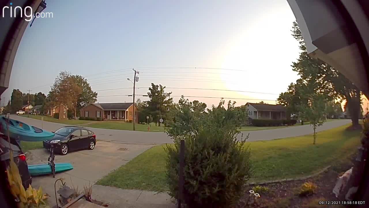 A car pulls into the garage and knocks two kayaks off the roof and they fall in the driveway. Security footage.