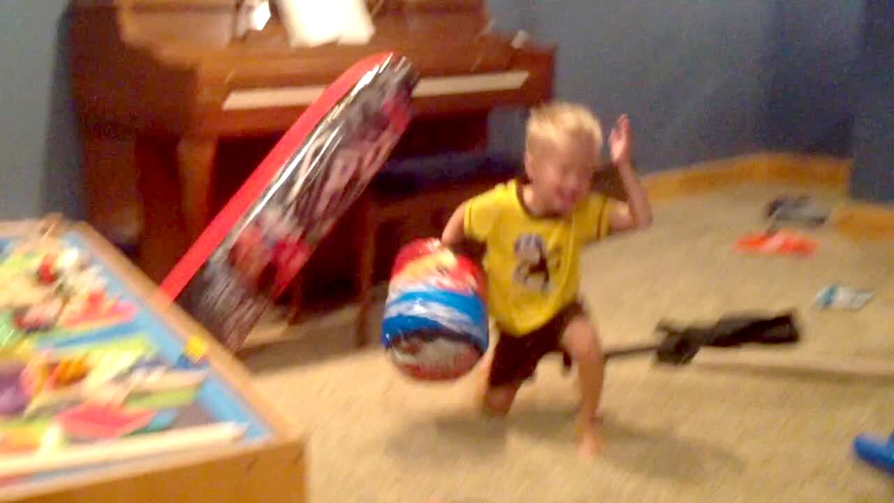 A father playing Don't Break the Ice with his children and tells his youngest son to tap lightly on the game and knock out only one piece. Instead the boy repeatedly slams on it with a toy hammer and knocks all of the pieces out at once.