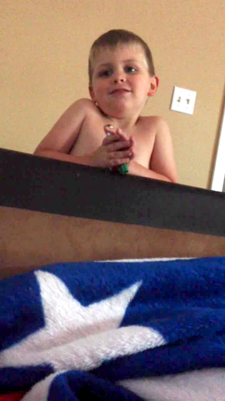 A woman films her broken glass front door while her tot son tells her he tried to hit a bee with a rock.