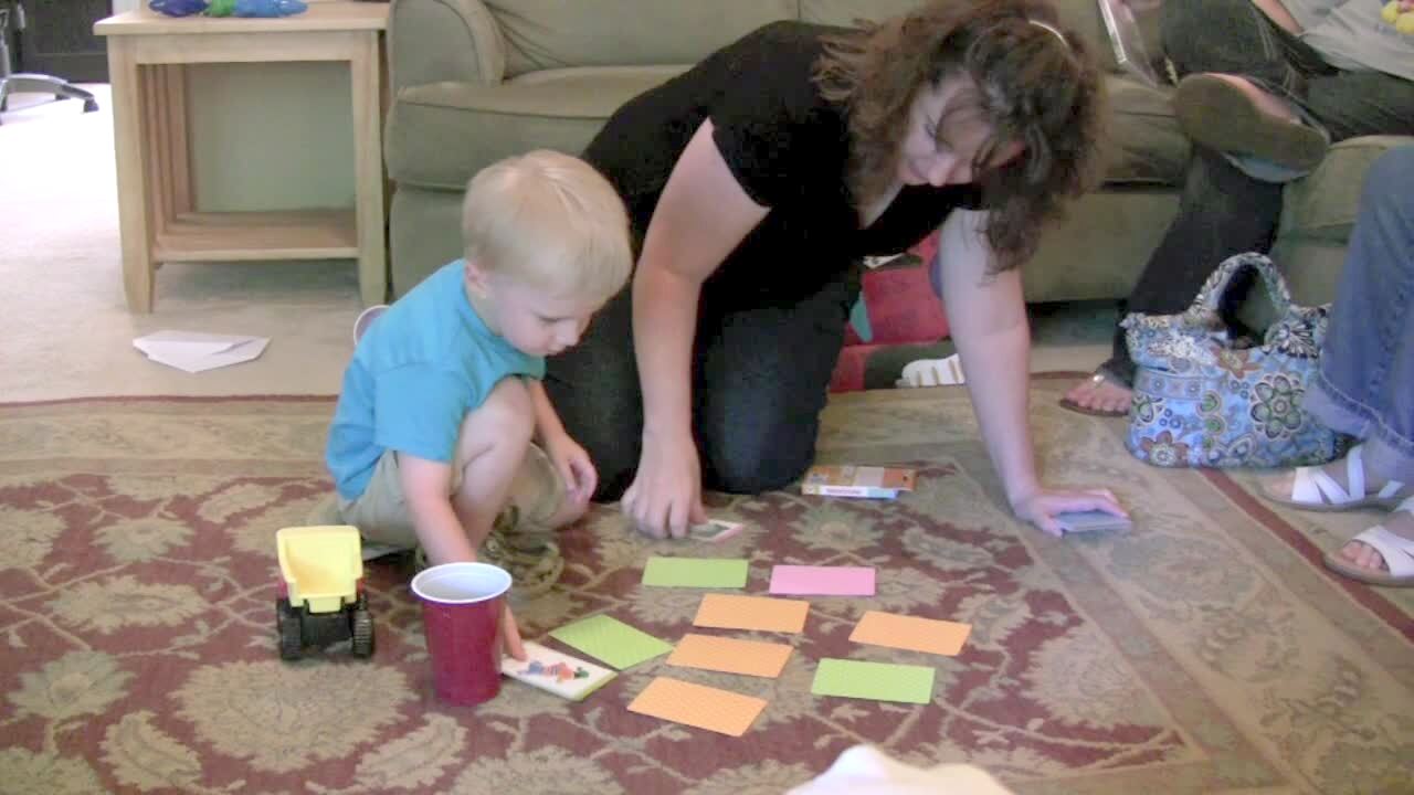 A woman shows a boy tot animal cards in the living room and the boy says the penguin card is his father.