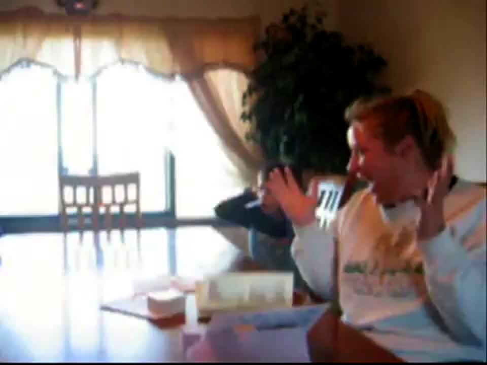 Mom surprised with a trip to Hawaii for her birthday. She reads the card & when she realizes, she screams & scares her son who's standing next to her. He covers his ears & jumps. Good reaction. Surprise.