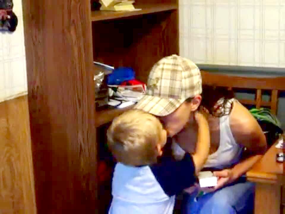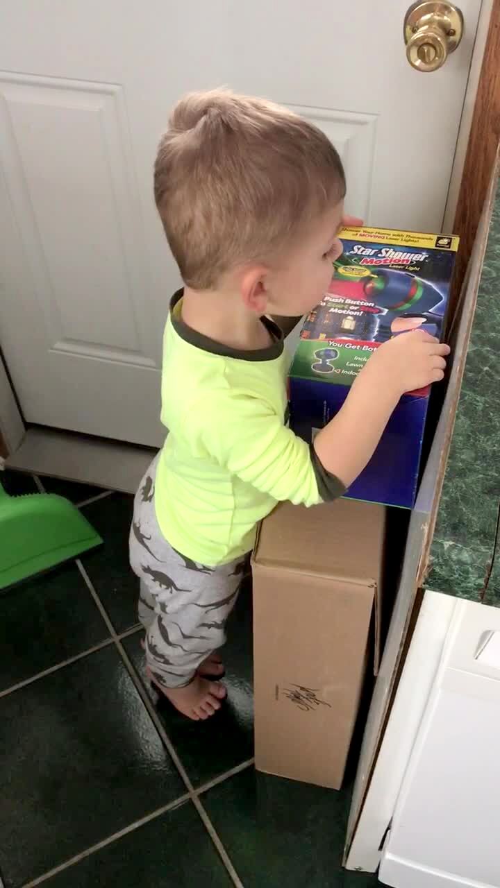 A tot boy sees a picture of a woman's finger on a box and he thinks it is his mom who is trapped inside. He taps on the thumb and cries to get his mom back.