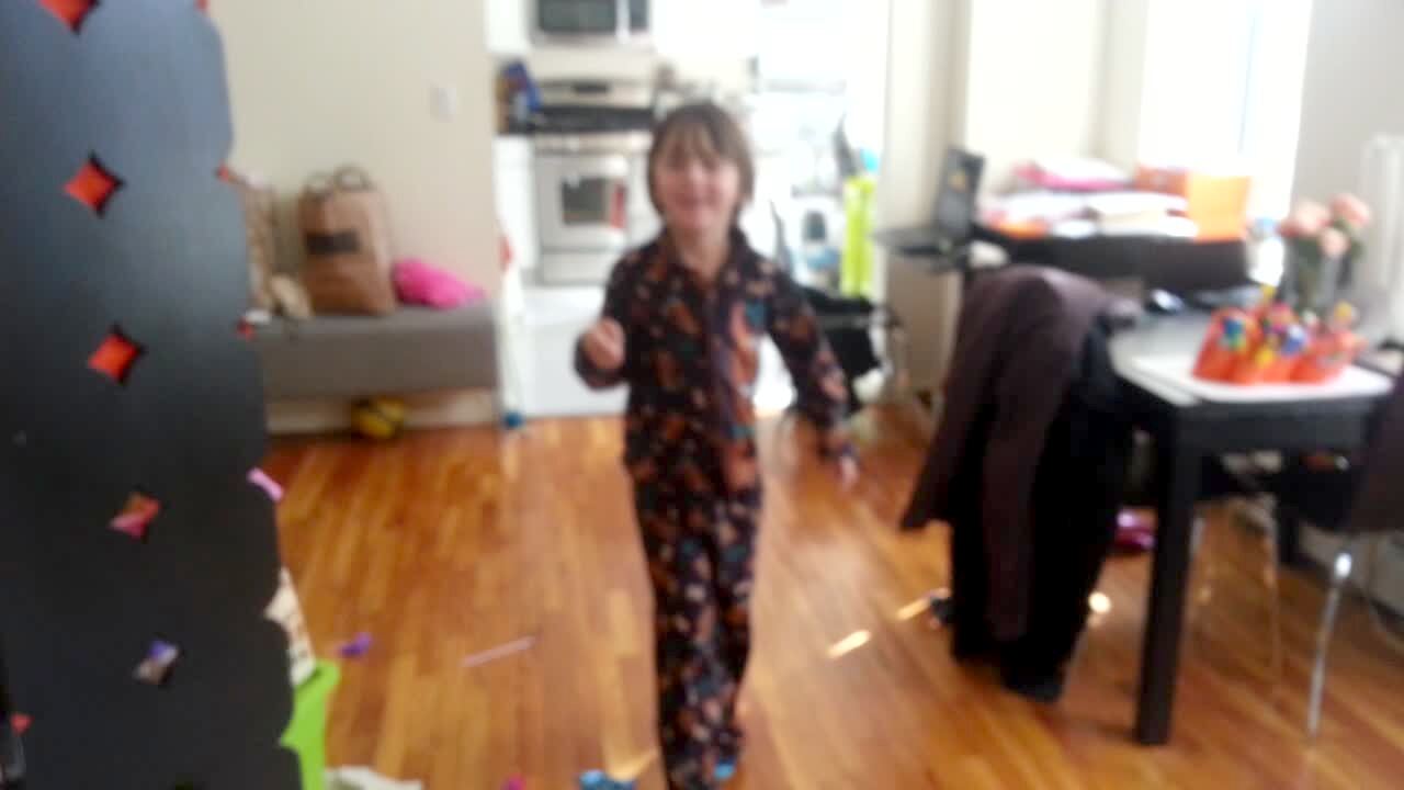 A young girl opens a small gift bag and a senior woman tells her that the gift bag is her own present. The girl says that nothing is inside and tells the senior woman "you guys must have been on the naughty list."