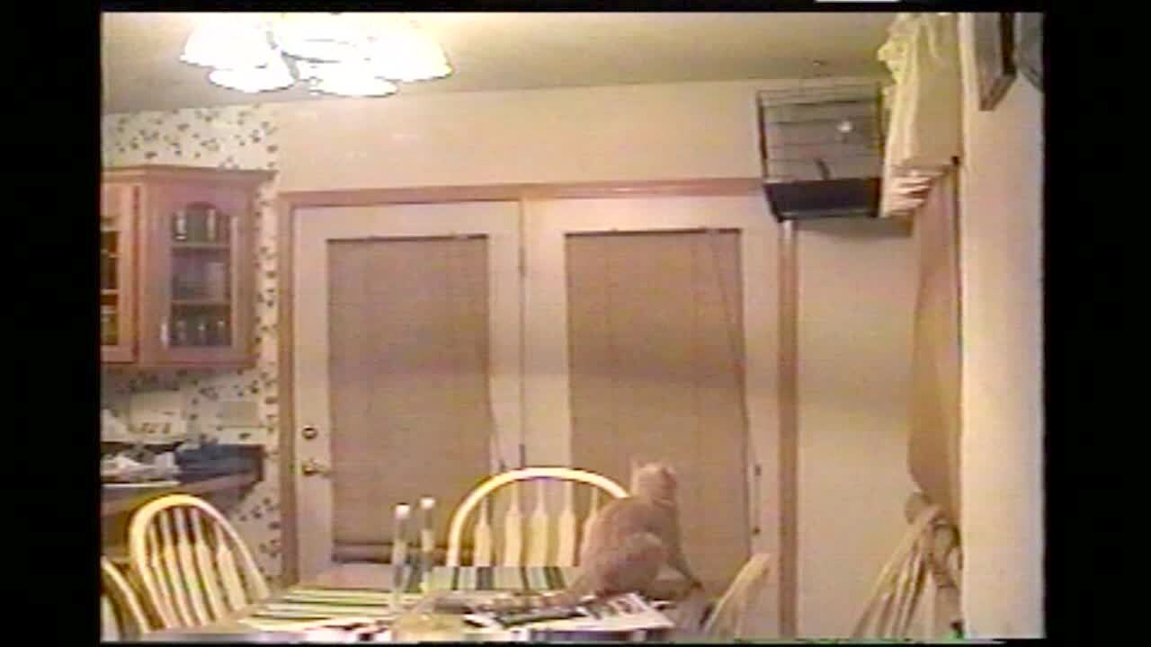 Cat on kitchen table stares at bird in cage hanging from the ceiling. Cat jumps really high & far and hits the cage. Silly pet.