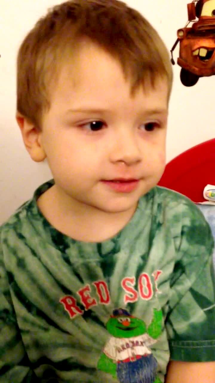 A tot boy recites his ABC's, but says AFV instead of TUV and ABC.