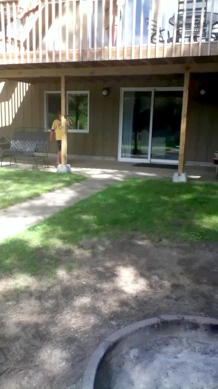 A boy walks around on a sidewalk in a front yard as the camera woman calls for him. A man on a house deck above the sidewalk pours 2 buckets of water on the boy and throws a water balloon at his head. The boy screams.