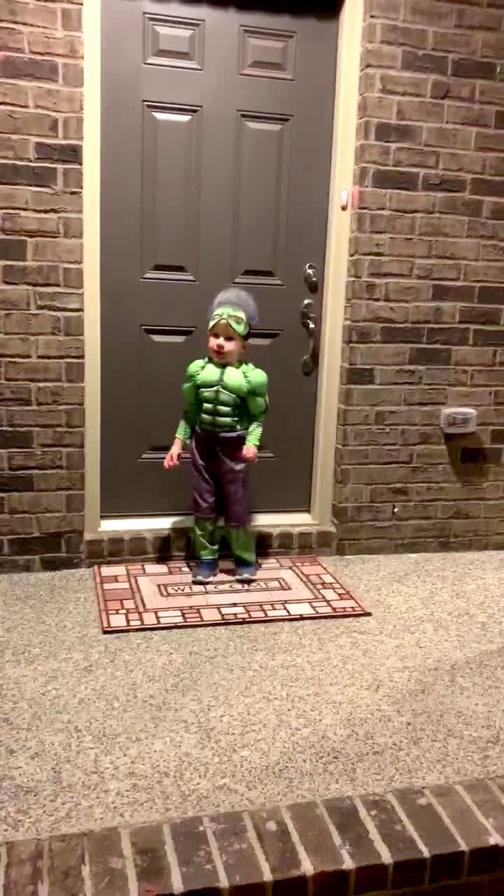 A tot boy trick-or-treats at a house on Halloween, and a man tells him to ring the doorbell. He jumps repeatedly to reach the doorbell, but is too short. He says "have to go to another house" and walks away.
