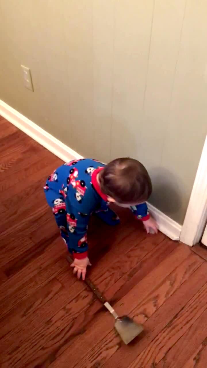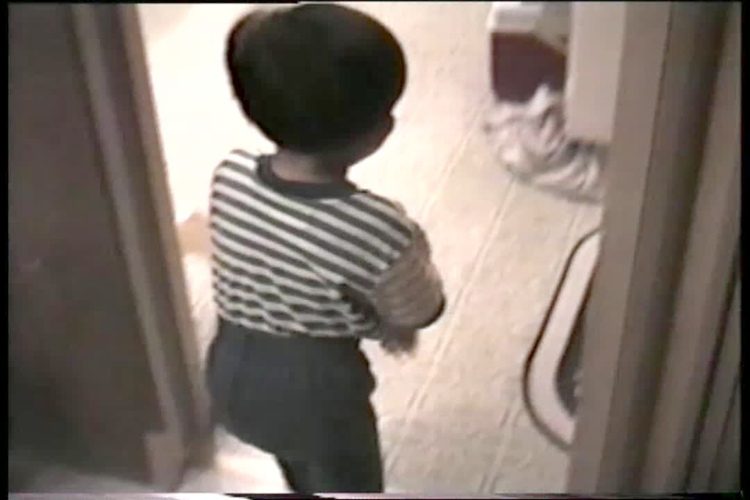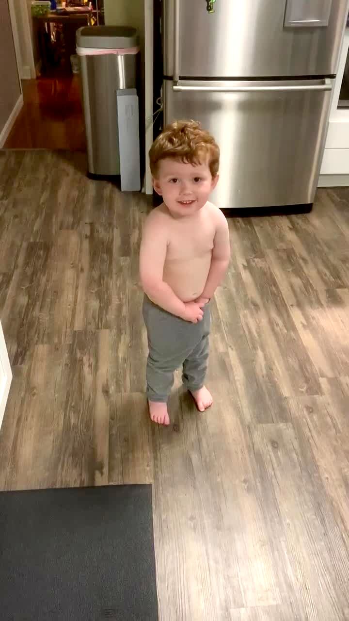 A tot boy sticks his hand in his pants in the kitchen and the man with the camera asks him what is in there. The boy says "a tape measurer" and then pulls the tape out from his pants and extends it up.