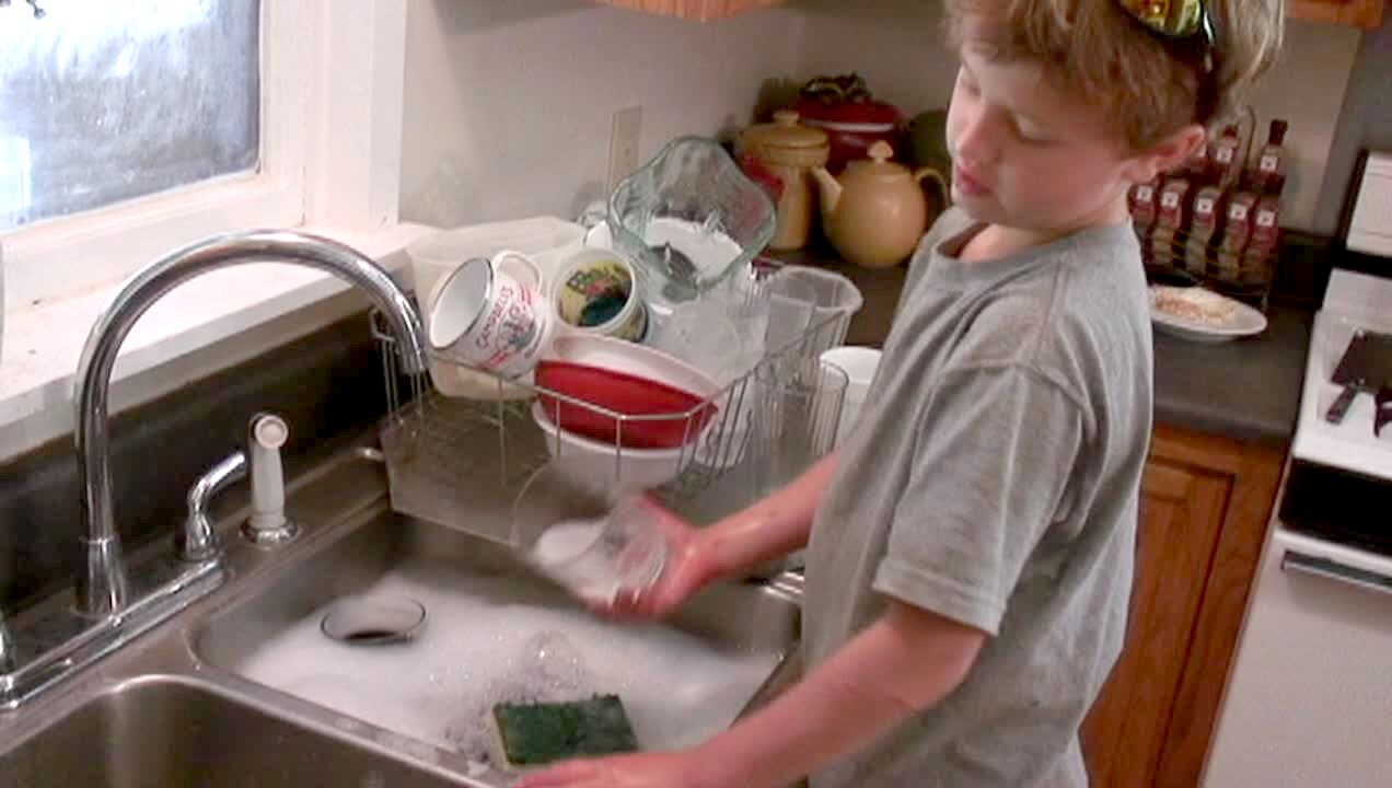Young boy washes dishes and talks about doing it carefully, then drops and breaks a glass.
