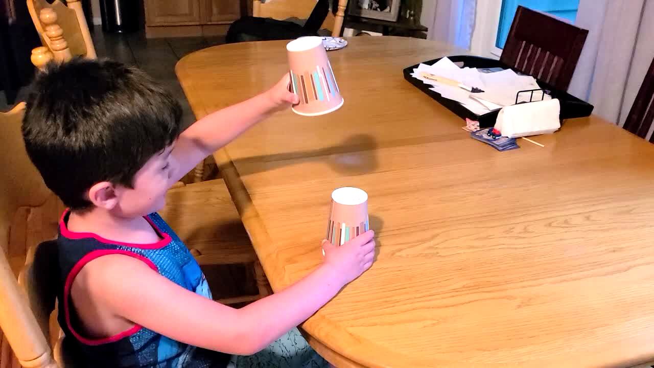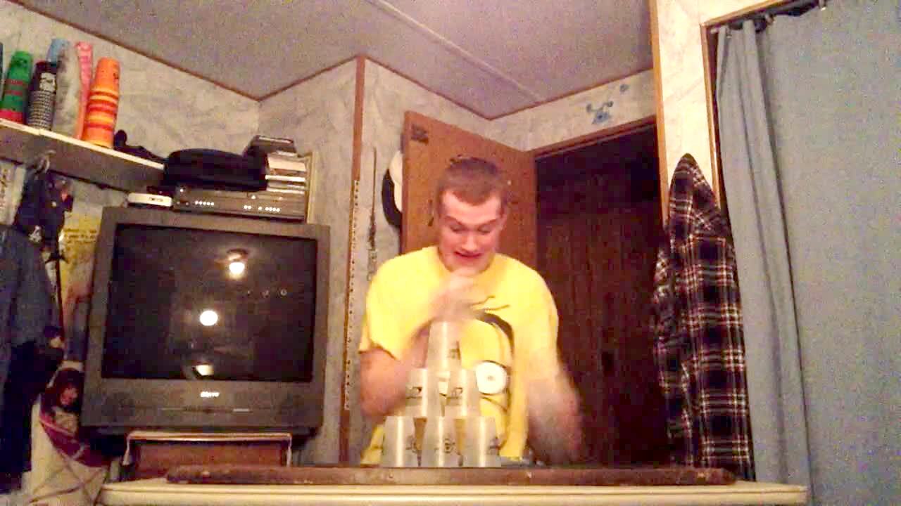 A teen boy rapidly stacks cups at home and then the stack falls, surprising him.