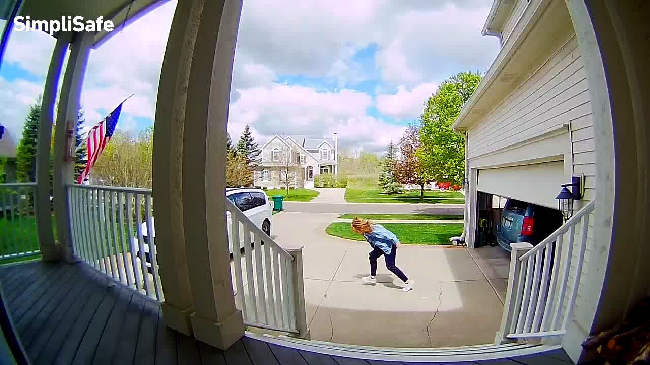 A woman runs underneath a garage door as it closes, but she trips and falls against the car in the driveway. Security footage.