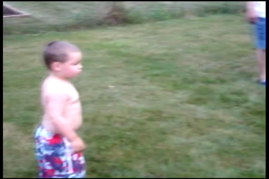 Man tries to get tot boy to jump over a sprinkler toy that spins around. Man tries it & falls backwards into a kiddie pool. Man has big Santa beard. Whole family laughs & claps.