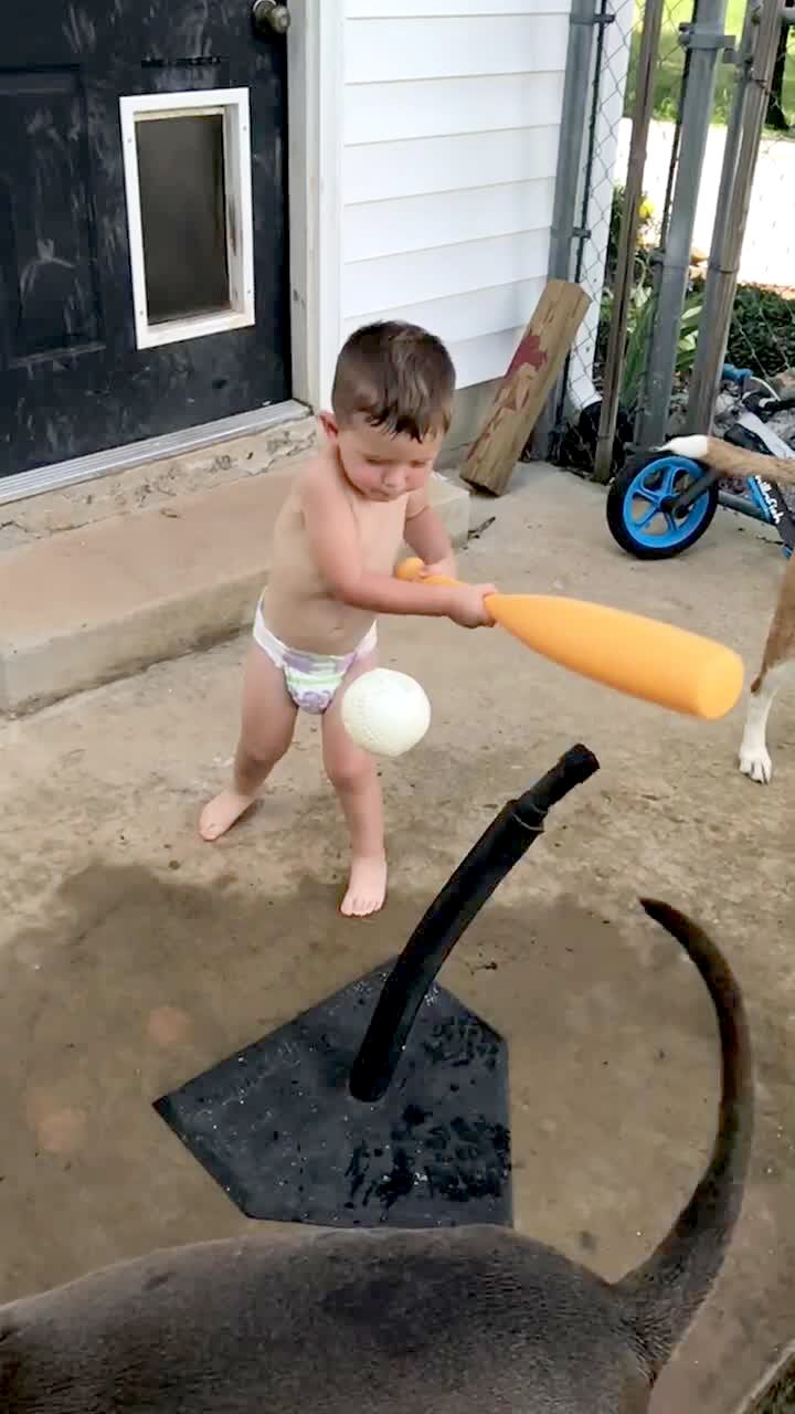 A tot boy in a yard hits a ball off a tee with a baseball bat and it hits a man in the groin and the tot boy laughs. Security camera.