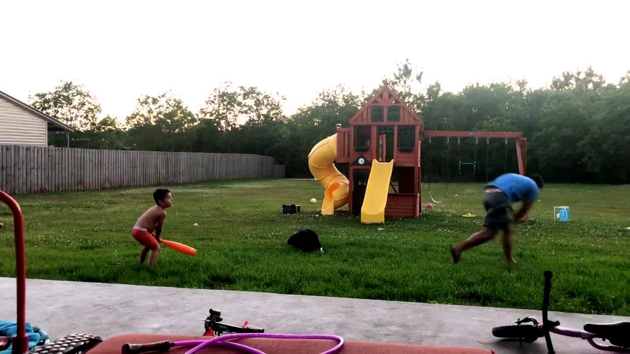 A man hits a piñata with a broom in the yard, and a young girl tells him to "put some back into it". A young boy then says "more back", and the man snaps the broom.
