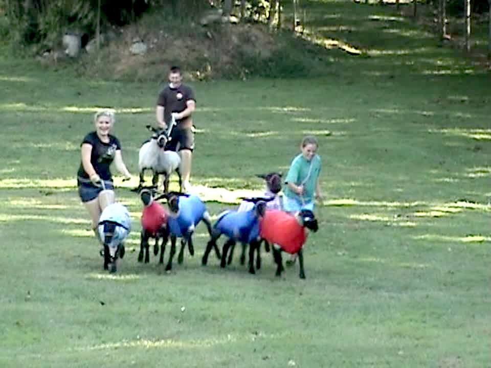 A young boy, girl, and woman run with several sheep on leashes outdoors. The woman falls down and lets go of her sheep. Short tail.